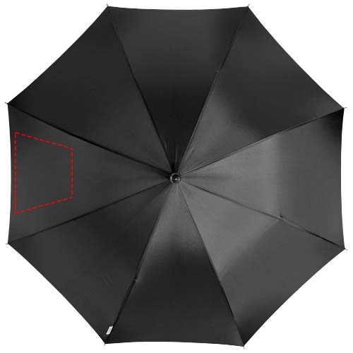 Exclusief ontworpen automatische openende paraplu. Metalen schacht en baleinen. Speciaal ontworpen rubber bekleed handvat met aluminium detail waarmee de paraplu aan de rand van een tafel kan worden gehangen. Geleverd met hoes in de kleur van de paraplu.