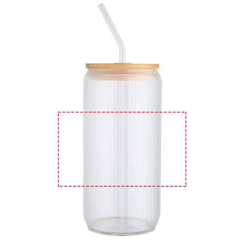 Borosilicaatglazen drinkfles met een glazen rietje en een duurzaam bamboe deksel. Ook dit ontwerp heeft een unieke geribbelde binnenkant en een gladde buitenkant, perfect voor logobedrukking. Geleverd in een gerecyclede kartonnen geschenkverpakking. Inhoud: 650 ml.