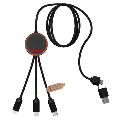 3-in-1 oplaadkabel van gerecycled PET met oplichtend logo en ronde bamboe behuizing. Het oplichtende logo is aan beide kanten zichtbaar. Voorzien van 3 connectoren (type C, micro USB, iPhone) en een dubbele USB-connector voor universeel gebruik. Geleverd in een TPU zakje, met een kaart van kraftpapier. Kabellengte: 1 meter. Inclusief 3 jaar garantie.