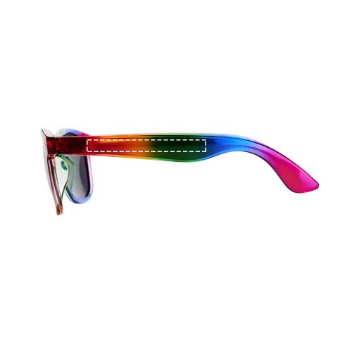 Sun Ray retrozonnebril met doorschijnend montuur en afwerking in trendy regenboogkleuren. Voldoet aan EN ISO 12312-1 en UV-400, glazen zijn van klasse 3.